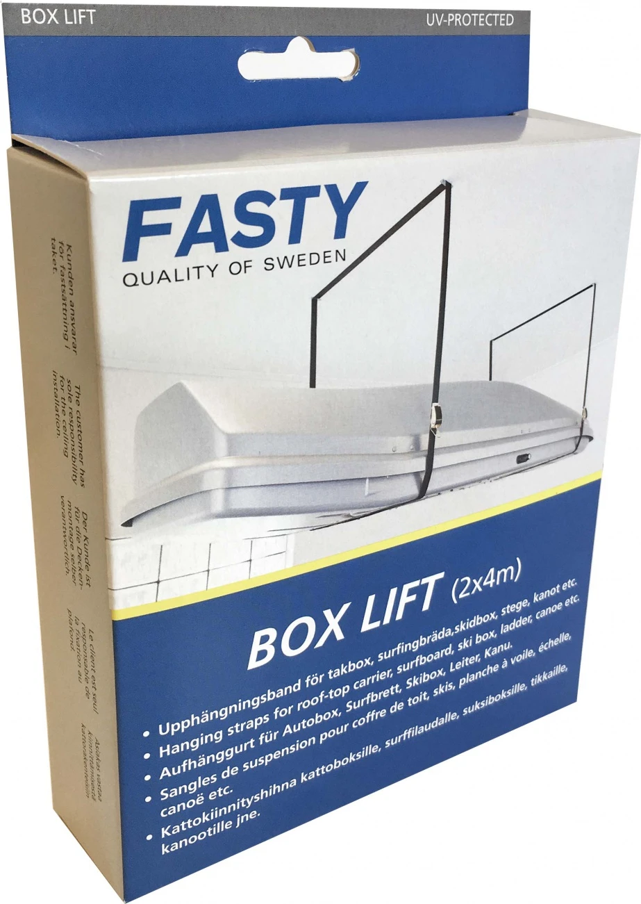 Fasty Boxlift on helppo ja yksinkertainen apu pitkien tavaroiden säilyttämiseen. Pakkauksessa on kaksi liinaa, joiden pituus on 4 metriä. Väri musta. Sisältää 2kpl hihnat, 4kpl kiinnitysraudat ja 8kpl kiinnitysruuvit 4x40mm.Fasty Boxlift auttaa säilyttämään esimerkiksi suksiboksit, sup-laudat, surffilaudat, kajakit, kanootit ym. esineet turvallisesti katossa, jolloin ne eivät vie lattiatilaa, eivätkä ole alttiina vahingoille.