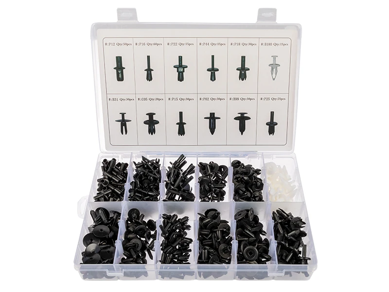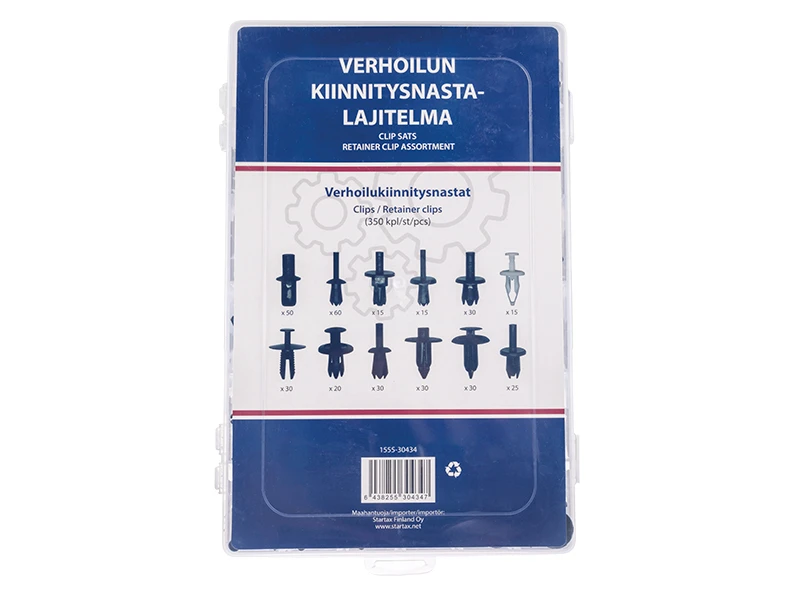 12 erilaista, yhteensä 350kpl sisältävä valikoima sisäverhoilun, suojamuovien, puskureiden ja muiden osien kiinnittämiseen tarkoitettuja muovinastoja.