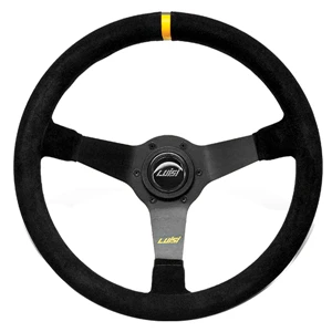 Mokkanahkapintainen ohjauspyörä kilpailukäyttöön. Ratin syvyys 75mm. Ratin kehässä ylhäällä keltainen merkkikehys.