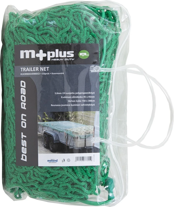 M+ HD Kuormaverkko, joustava reunaköysi. Peräkärryn kuormaverkko150x300cm. Verkon silmäkoko 45 x 45 mm. UV-suojattu polypropeeniköysi. Joustava reunanauha. Suojapussissa.