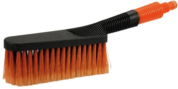Pesuharja. Kokonaispituus 34cm, harjaosan pituus 17cm ja leveys 6/4cm. Varressa letkuliitin.