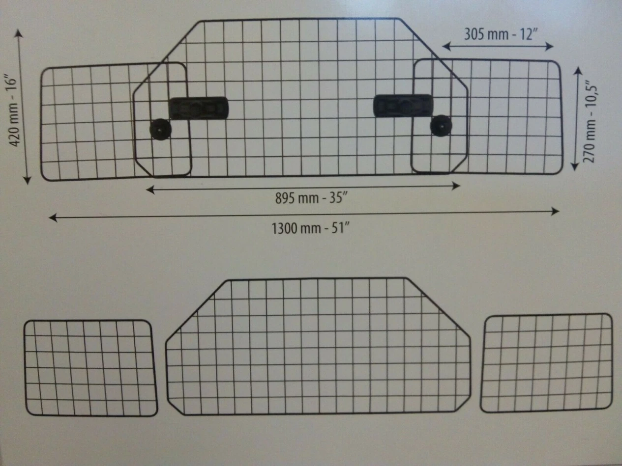Kätevä koiraveräjä lemmikkieläinten, matkatavaroiden ja varusteiden kuljettamiseen autossa. Yleismallinen sopivuus; sopii useimpiin farmari- ja maastoautoihin. Helppo asentaa ilman työkaluja. Puhdistetaan kostealla liinalla. Ristikon läpi on hyvä näkyvyys auton taakse. Leveät kumipäädyt estävät auton naarmuuntumisen. Materiaali: A3-teräs, ABS + PVC. Putken seinämän paksuus: 0,6 mm, putken halkaisija: 13/16/19 mm. Käsittely: musta pulverimaalaus. Leveys säädettävissä 80-140 cm, korkeus säädettävissä 32-53 cm. Keskimmäisen pääverkon mitat: korkeus 42cm, leveys 89,5cm. Reunimmaisten verkkojen mitat: korkeus 27cm, leveys 30,5cm.