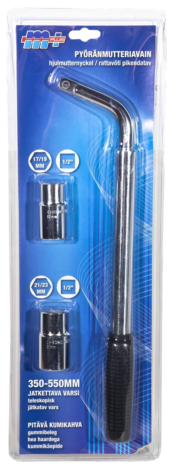Rengastöihin kätevä teleskooppivarrellinen 350-550 mm pyöränmutteriavain 17 / 19 ja 21 / 23 mm hylsyllä ja 1/2″ karalla.