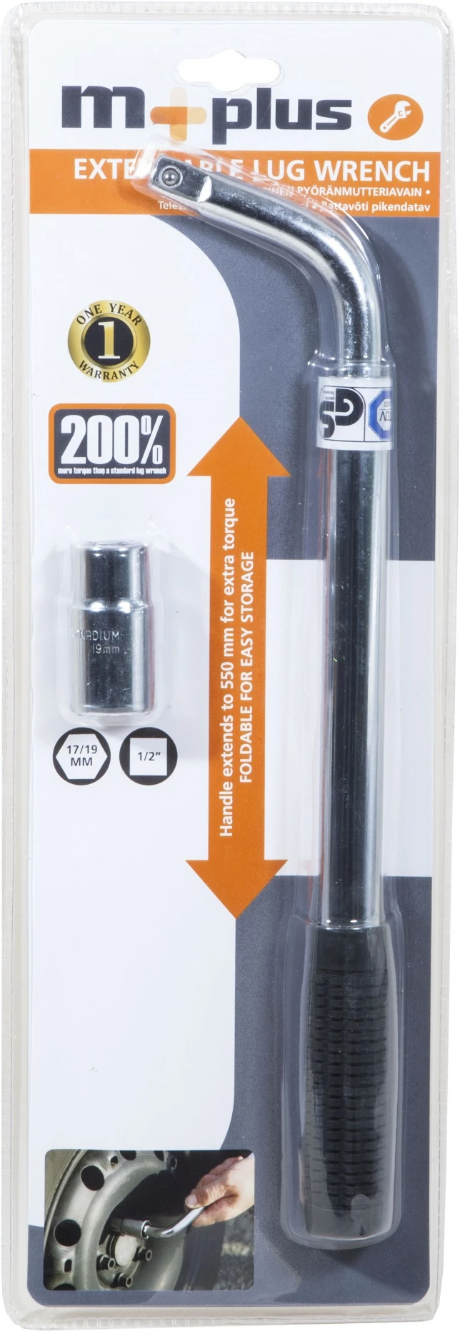 Rengastöihin kätevä teleskooppivarrellinen 350-550 mm pyöränmutteriavain 17 / 19 mm hylsyllä ja 1/2″ karalla.