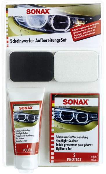 Ajovaloumpioiden kirkastussarja. Mattaantuneiden ja kellastuneiden umpioiden hiontaan ja puhdistukseen. Kirkastaa umpiot parantaen näkyvyyttä.Pakkaus sisältää: 75 ml SONAX Headlight Polish Hionta-aine, 2 SONAX Headlight Sealant Cloths Pinnoiteliinaa, 2 Kiillotussientä, 4 Vesihiomaruusuketta P5000, 4 Kiillotusliinaa.