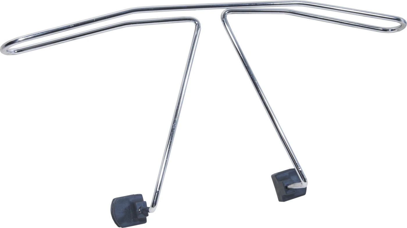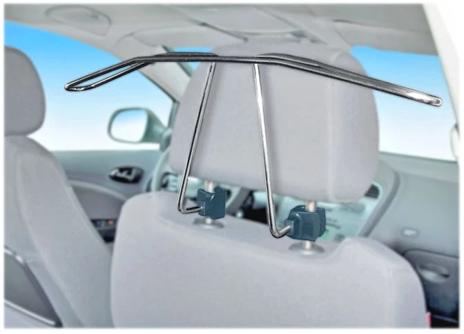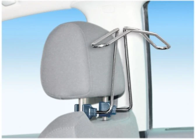 Krominen vaateripustin, joka on tarkoitettu auton niskatukeen kiinnitettäväksi. Vaateripustin esim. takeille ja paidoille, yleismallinen. Leveys 50cm.